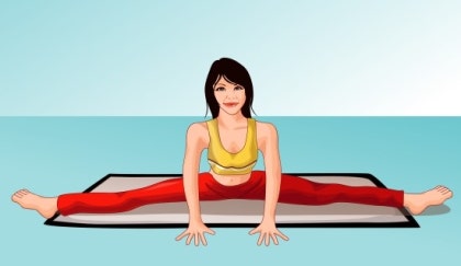 - 매트에 앉아 양다리를 가능한 넓게 벌려줍니다. 무릎은 곧게 펴고 발끝은 천장을 향하게 합니다.