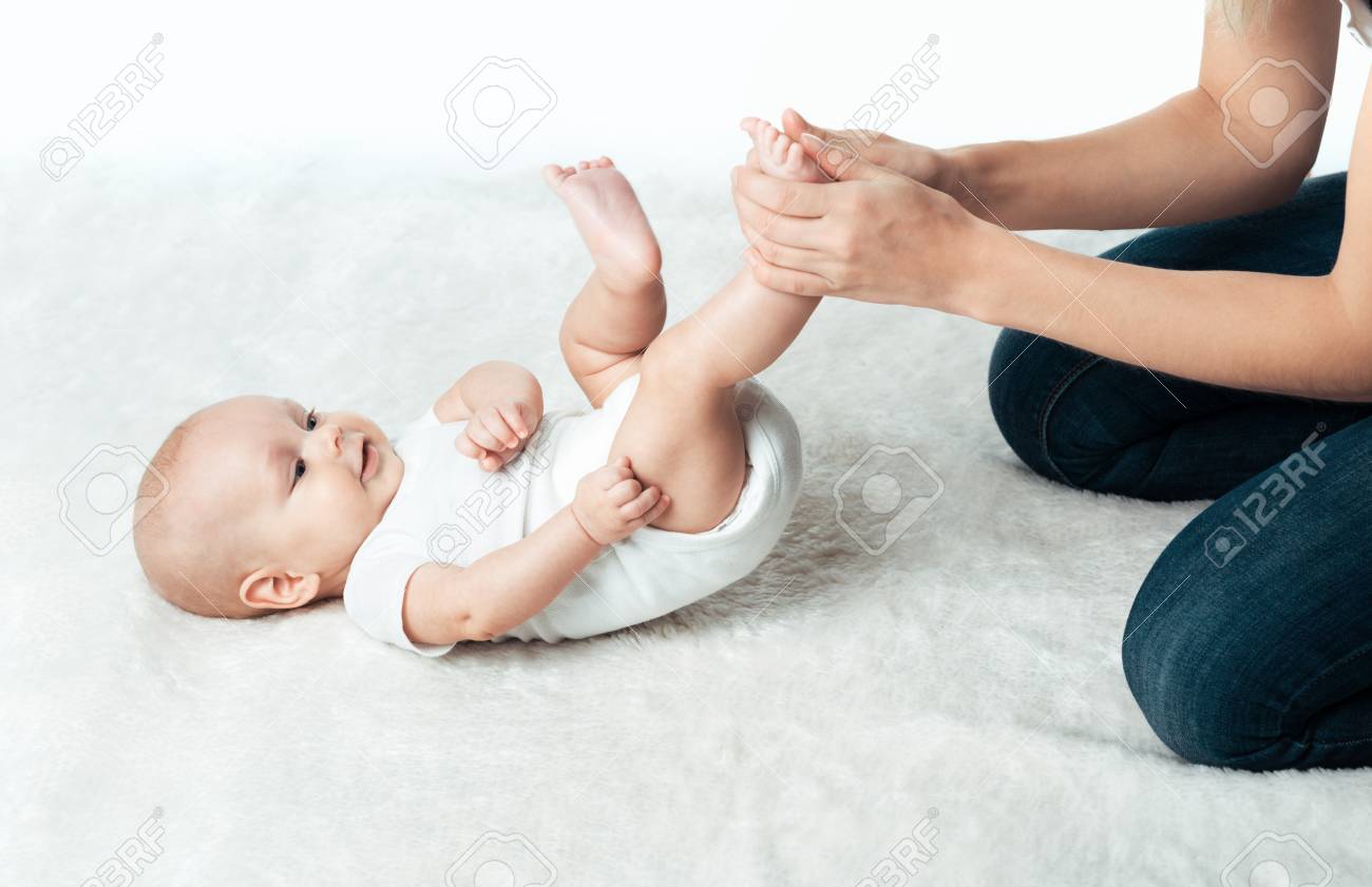 아기의 두 다리를 살짝 잡고 자전거 페달 밟듯 천천히 돌려주세요. 복부 가스 배출에 도움이 됩니다.